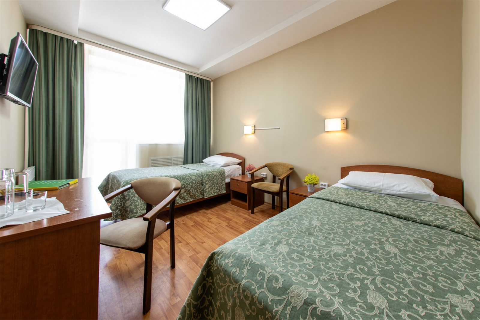 Площадь номера - 19-22 кв.м. 2 осн. места. 1 доп. место. Балкон. Мебель: вешалка, зеркало, кровати односпальные, прикроватные тумбочки, стол, стулья, шкаф встроенный. Оборудование: набор посуды, телевизор, холодильник. Санузел: с душем, туалетные принадлежности. Сервис: Wi-Fi бесплатно, смена полотенец, смена постельного белья, уборка номера.